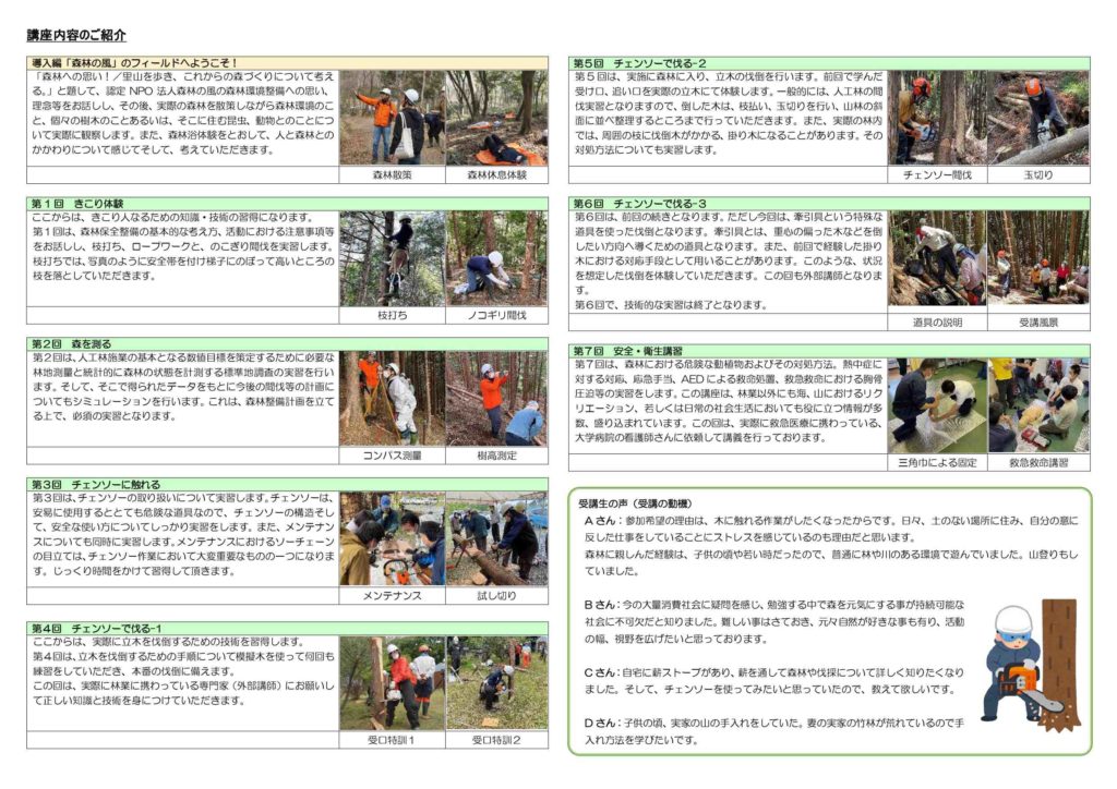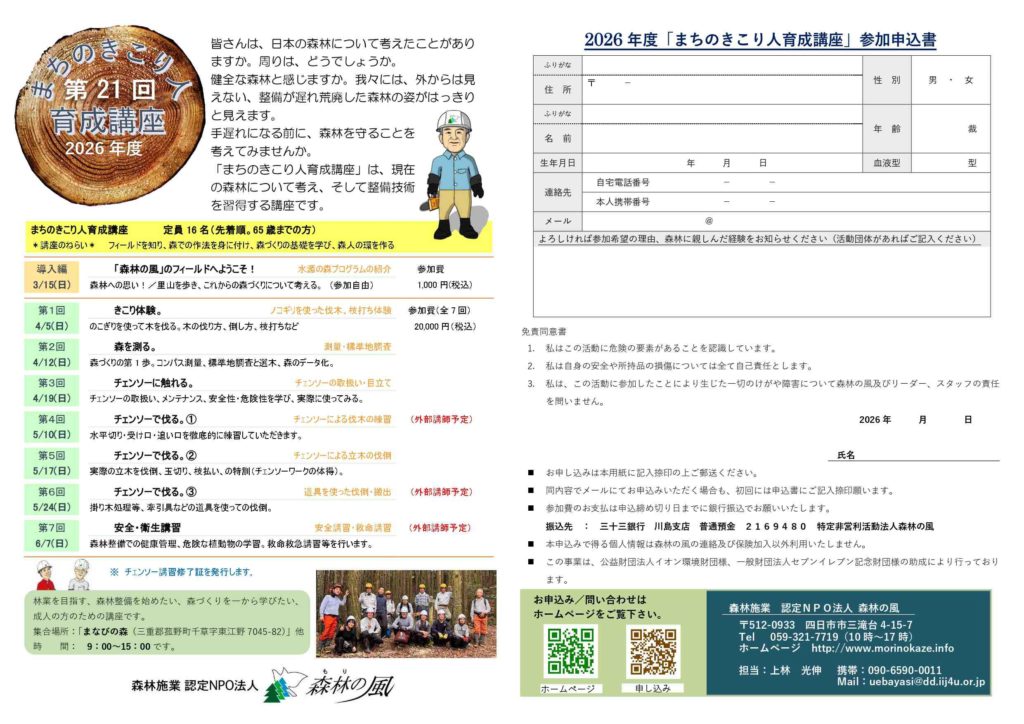 こんにちは森林の風事務局です。毎年、好評を得ております「まちのきこり人育成講座」の募集受付開始のお知らせです。